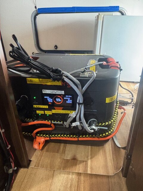 当車のバッテリーは400AHのため、外部充電による空の状態からの完全充電は400AH÷20A=20時間ほどかかります。走行充電(約50A)、ソーラー充電(10A~20A)と組合わせて充電し、計画的に電気を使いましょう。