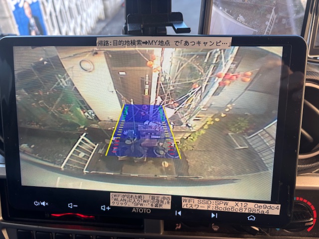 上図はバック時にカーナビ画面が後方カメラ⑥に切り替わり、また黄色い補助線(車幅2mの線)がでるため、スムーズに車庫入れができます。