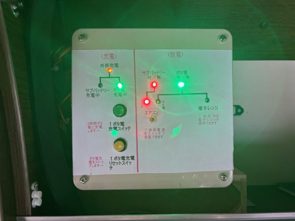 また外部充電する時もデフォルトはサブバッテリーに充電されぱすが、制御盤のスイッチによりポータブル電源に3時間充電先を切り替える事ができます(3時間後にサブバッテリー側に復帰します)。