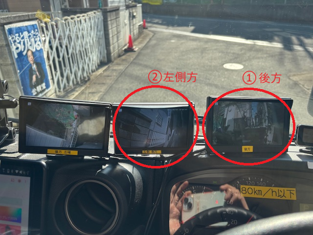 ↑後方①、左側方②のモニター